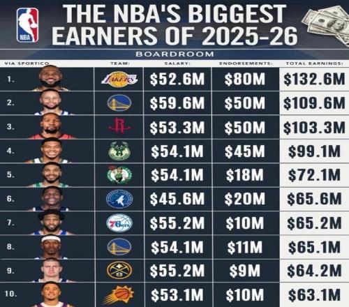 2025-26赛季,NBA收入最高的球员当中,詹姆斯的年薪高达5260万美元,商业收入8000万美元,总计1.326亿美元高居第一。库里年薪高达5960万美元,商业收入5000万美元,总计1.096亿美元,排名第二。杜兰特年薪高达5330万美元,商业收入5000万美元,总收入1.033亿美元,排名第三。