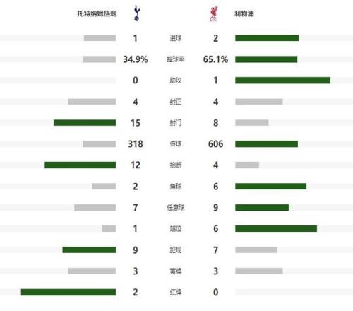 余下的时间,热刺大举压上让利物浦非常被动,第83分钟替补登场的里沙利松,利用角球的机会,将比分追至1-2,4分钟之后,里沙利松抓住琼斯失误的机会,再次完成打门,可惜这一次被封堵,伤停补时阶段,罗梅罗报复性踢人,吃到第二张黄牌也被罚下,最终热刺只能接受主场输球的结局。